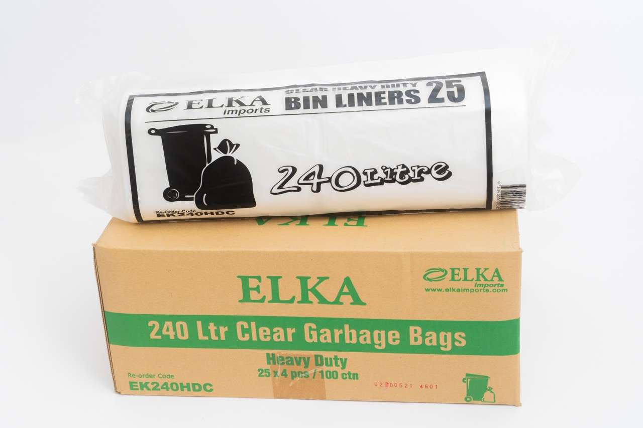 Transparent 240 L liners, 100 per carton. High-visibility for sorting, ideal for waste control.