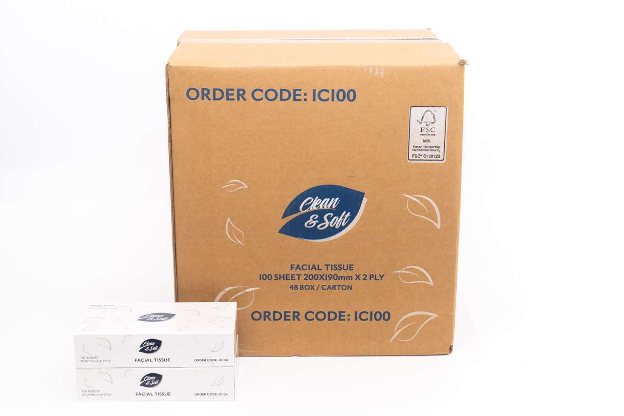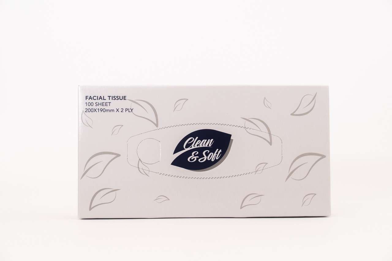 Clean and Soft 2-ply facial tissues, 100 sheets per box. Generous size (200 x 190 mm). Suitable for home or office.