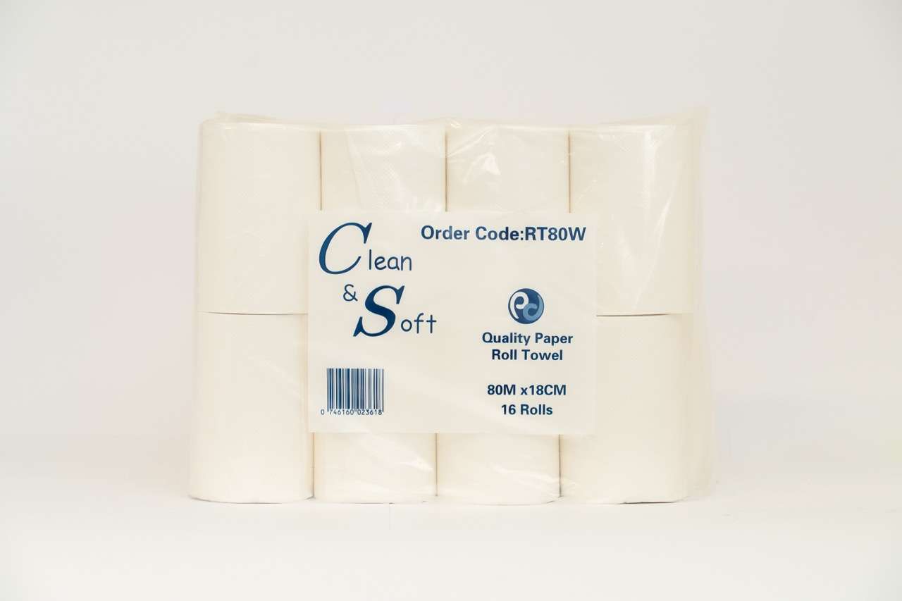 White roll virgin towels, 18 cm wide, 80 m per roll, 16 rolls total. Smooth texture ideal for general-purpose dispenser use.