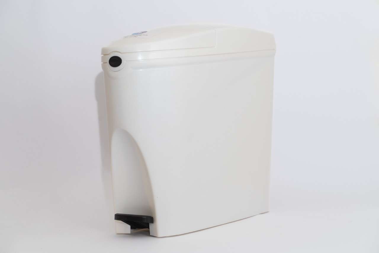 Foot-pedal operated sanitary bin—maximizes hygiene in washrooms with hands-free operation.